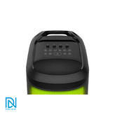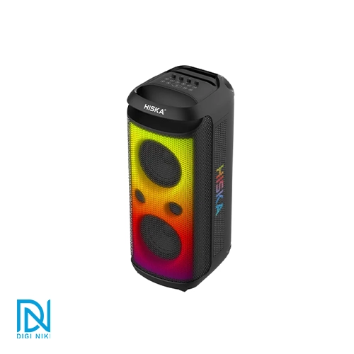 اسپیکر بلوتوثی قابل حمل هیسکا مدل PARTY BOX 1018 صدای کامل و شفاف و طراحی فوق العاده ای دارد که آن را به همراهی کامل در مهمانی ها، محل کار یا حتی سفر تبدیل کرده است. دستگاه در دو حالت بیسیم و باسیم قابل استفاده است. ابعاد دستگاه 348 × 403 × 839 میلیمتر است. در عینحال که آنقدر بزرگ هست که بتواند صدای قوی و شفافی به شما تحویل دهد. صدای آن به وضوح واضحتر و بلندتر از صدای سایر اسپیکرهای بلوتوث هم رده خود است. اسپیکر 1018 هیسکا از نظر طراحی واقعا زیبا است. این اسپیکر تقریبا تمامی امکاناتی که یک اسپیکر گران قیمت باید داشته باشد را در خود جای دادهاست. دستگاه به شکل یک مستطیل ایستاده طراحی شده که گوشههای نرمی دارد. قسمت جلویی آن به صورت کامل بلندگوهای اسپیکر هیسکا 1018 است و در قسمت بالایی آن دکمههای دستگاه و خروجی و ورودیهای آن در پشت اسپیکر قرار دارد. پارتی باکس 1018 هیسکا ویژگیهای فنی زیادی دارد. اول از همه می توان به توان خروجی قدرتمند 150 واتی آن اشاره کرد که دارای دو اسپیکر 8 اینچی و دو تیوتر 3.5 اینچی می باشد. دیگر ویژگی مهم آن باتری 9000 میلی آمپر ساعتی این پارتی باکس است که تا 6 ساعت در بالاترین صدا به شما امکان پخش موزیک می دهد. از دیگر ویژگی های جذاب این مدل قابلیت ضد آب بودن می باشد که به راحتی میتوانید در سفر هایتان استفاده کنید. پارتی باکس 1018 از استاندارد IPX4 بهره میبرد که مقاوم در برابر پاشش آب می باشد. این اسپیکر دارای نورپردازی جذاب RGB هماهنگ با موزیک می باشد که می توانید همزمان با پخش موسیقی مورد علاقه تان از آن لذت ببرید. همچنین این اسپیکر مجهز به فناوری TWS و بلوتوث نسخه 5.3 است که تا 10 متر محدوده عملکرد دارد و دارای ورودی های متعدد از جمله USB/ AUX/TF CARD/ GUITAR / RADIO/ REMOT CONTOROL/ و میکروفون وایرلس می باشد.