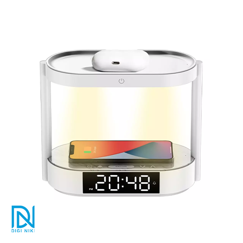 این استند و شارژر مغناطیسی ساخته شده از پلاستیک مقاوم است؛ به دلیل کارایی چهار کارهای که در اختیارتان قرار میدهد از آشفتگی میز جلوگیری میکند. این شارژر چند کاره در دو بخش طراحی شده؛ بخش بالایی آن مناسب شارژ هندزفری بلوتوثی است و بخش پایین هم برای شارژ بی سیم گوشی طراحی شده است. روی بدنه آن تعدادی کلید تعبیه که برای خاموش و روشن کردن، تنظیم کردن ساعت و آلارم و همچنین برای تنظیم میزان روشنایی کاربرد دارند. روشنایی چراغ خواب هم قابل تنظیم در سه سطح کم، متوسط و زیاد بوده و میتوانید با توجه به نیاز خود میزان تابش نور را تنظیم کنید. چراغ خواب مجهز به 18 الایدی SMD2835 است؛ دمای رنگ 4200 ± 400K با نور ملایمی را ارائه میکند و از شار نوری 100-150LM برخوردار است. نمایشگر دیجیتال هم برای نمایش ساعت است. ساعت زنگدار دو گانه هم امکان تنظیم زمان در دو ساعت متفاوت را برایتان امکانپذیر کرده است. ورودی آن DC 12V/2.5A با آداپتور فیش 3 پین بریتانیا است و از خروجی 5W و 10W پشتیبانی میکند. برای جلوگیری از رسیدن آسیب به باتری موبایل هم تراشهای درون آن قرار گرفته که حفاظتهای چندگانه از قبیل شارژ بیشازحد، دمای بالا، ولتاژ بیشازحد، جریان بیشازحد، اتصال کوتاه و ... را ارائه میدهد.